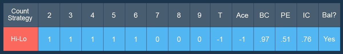 BC, PE, IC, and Bal? parameters are quite similar to those of the Hi-Lo method, with minor variations. The high Betting Correlation of 98 is a sign of a solid yet versatile strategy. Since the other parameters carry practically the same weight, we’d like to point your attention at Bal. As expected, when the sum of an entire deck of cards is different than 0 (in this case it’s 4) the system isn’t balanced.
