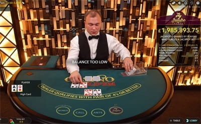 At Live Casino Hold’em, you have access to a chat window and you can easily communicate with the dealer, which comes in handy sometimes and right below you will see the table limits. You can select and adjust the table limits that are right for you beginning with £1.25 – £25, £1 – £50 or £2 – £100. Last but not least, the angle of the camera can be adjusted for a view that suits you best. One cool feature is that you can mark a dealer as a favourite and you will be notified when he’s up next and that is brilliant because I have a few dealers that put money in my pocket every time they host a session. Try it right now, it’s awesome! Let’s compare that with Evolution Gaming Casino Hold’em live game that can be found at Royal Panda, for example. The wagers and the payouts are the same, but you have a very specific new betting option. It goes by the name of Jumbo Jackpot and yes – you read that right! – Evolution Gaming incorporated a jackpot in a game of Casino Hold’em.