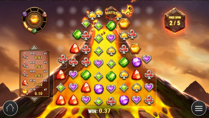 Getting three or more Volcano Scatter symbols awards 10 free games and triggers the bonus round. Depending on the number of scatters, players can get 4x, 6x, or 20x total bet prizes. Every Fireball that lands on the reels award the prize it fell on. If 3+ scatters appear during the free game, a player is awarded 10 extra free spins.